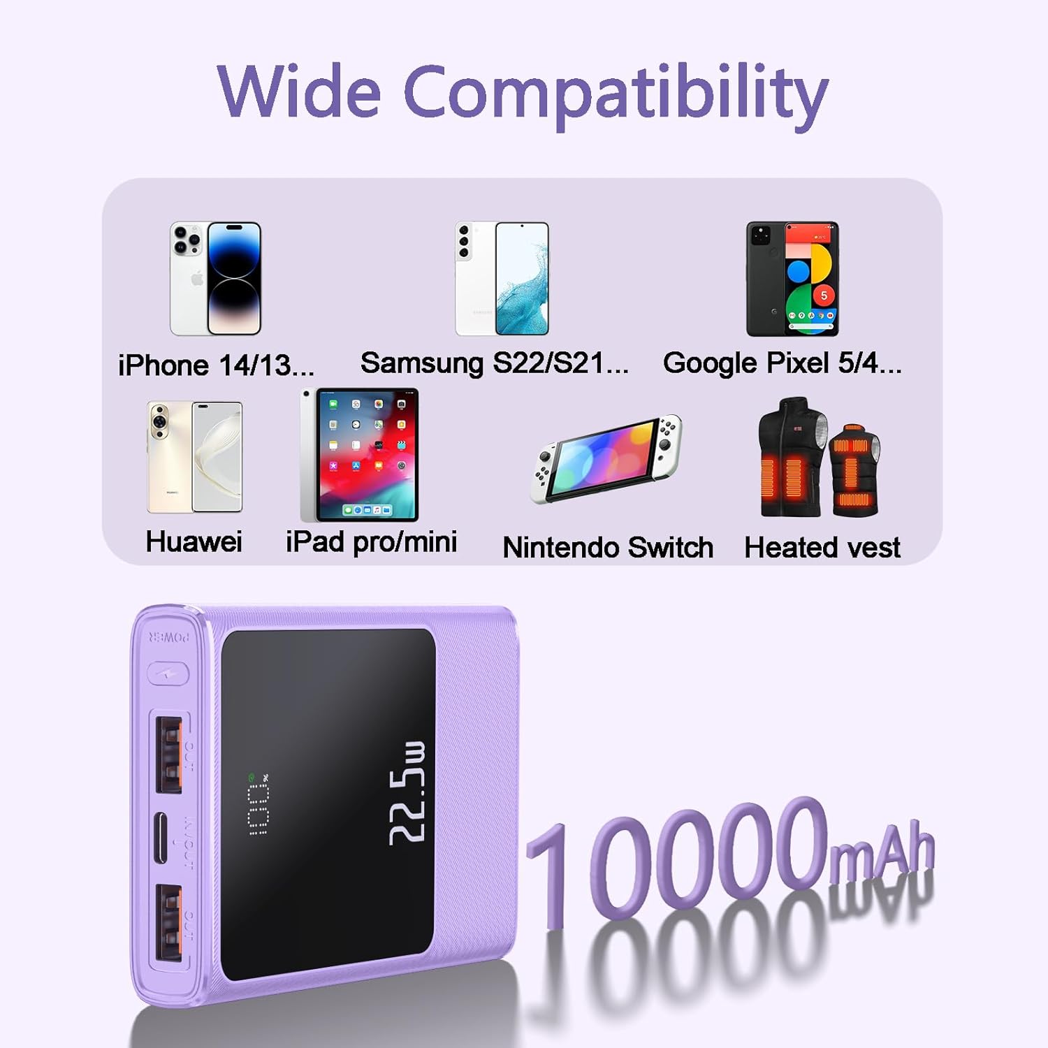 10000mAh Small Power Bank Fast Charging, 22.5W Mini USB C Portable Charger with Battery Pack Compact External Battery Bank for iPhone Samsung Heated Gilet Vest Jacket Scarf (Purple)