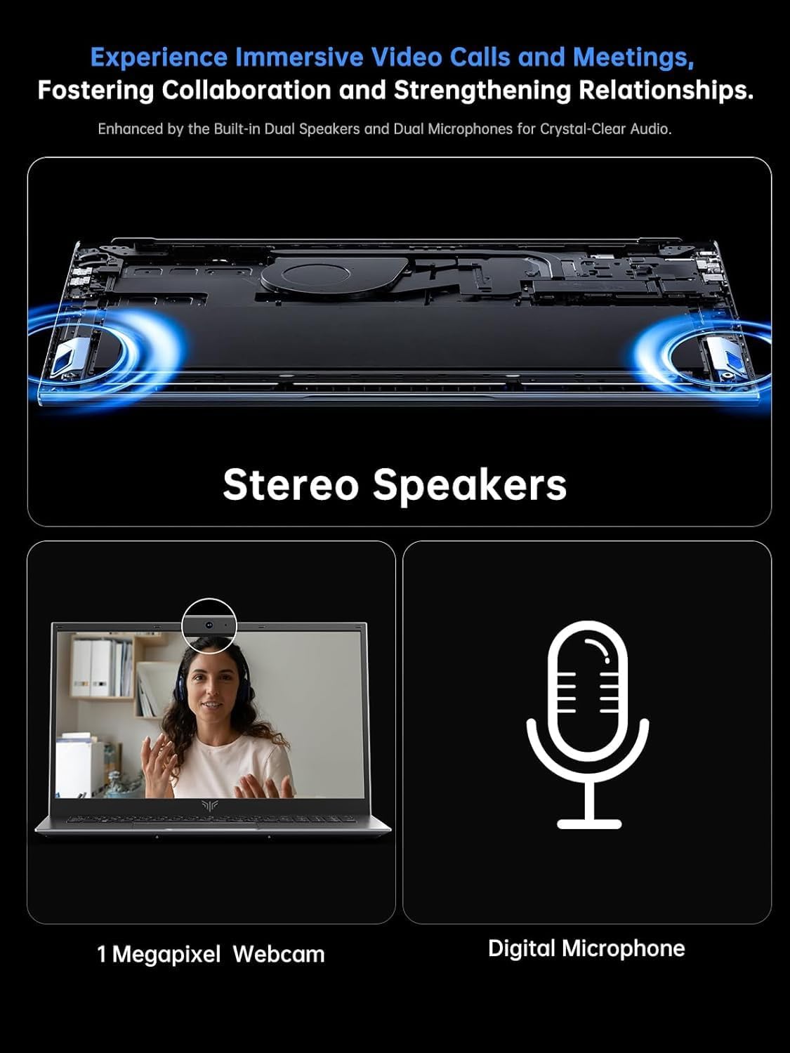 【Enhanced Multimedia Experience】Dual 1.5W speakers deliver crisp audio for video calls or music, while the DMIC microphone captures clear voice input. The responsive all-in-one touchpad and 1MP webcam round out a user-friendly setup.