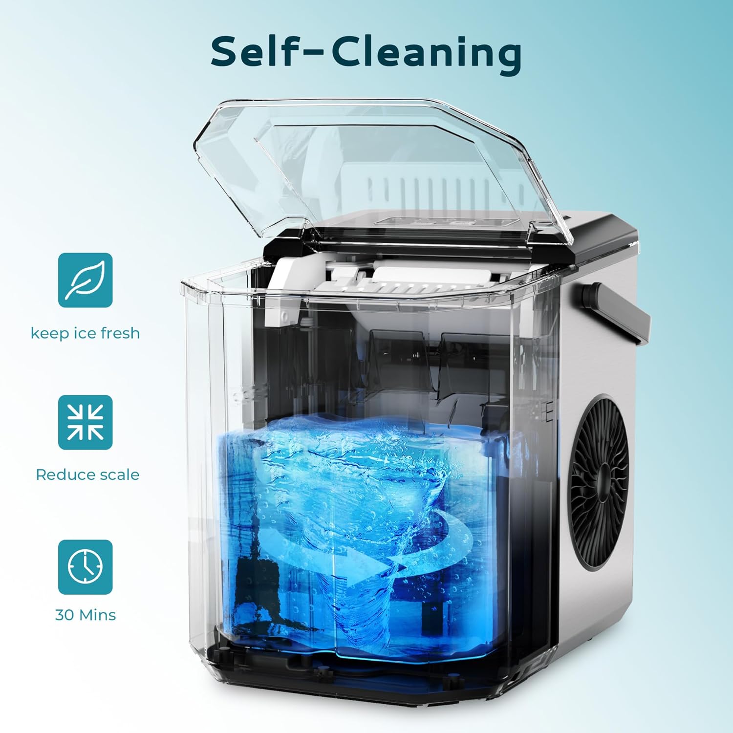 【Portability】Our countertop ice maker is compact in size, measuring only 23.5 x 29.5 x 29 centimeters and weighing just 6.2 kilograms. Equipped with a handle, you can easily carry this portable ice maker to your bedroom, kitchen, camping site, or wherever you desire, and enjoy the coolness of ice and ice cubes at your convenience! Stay cool even during the hottest British summers.