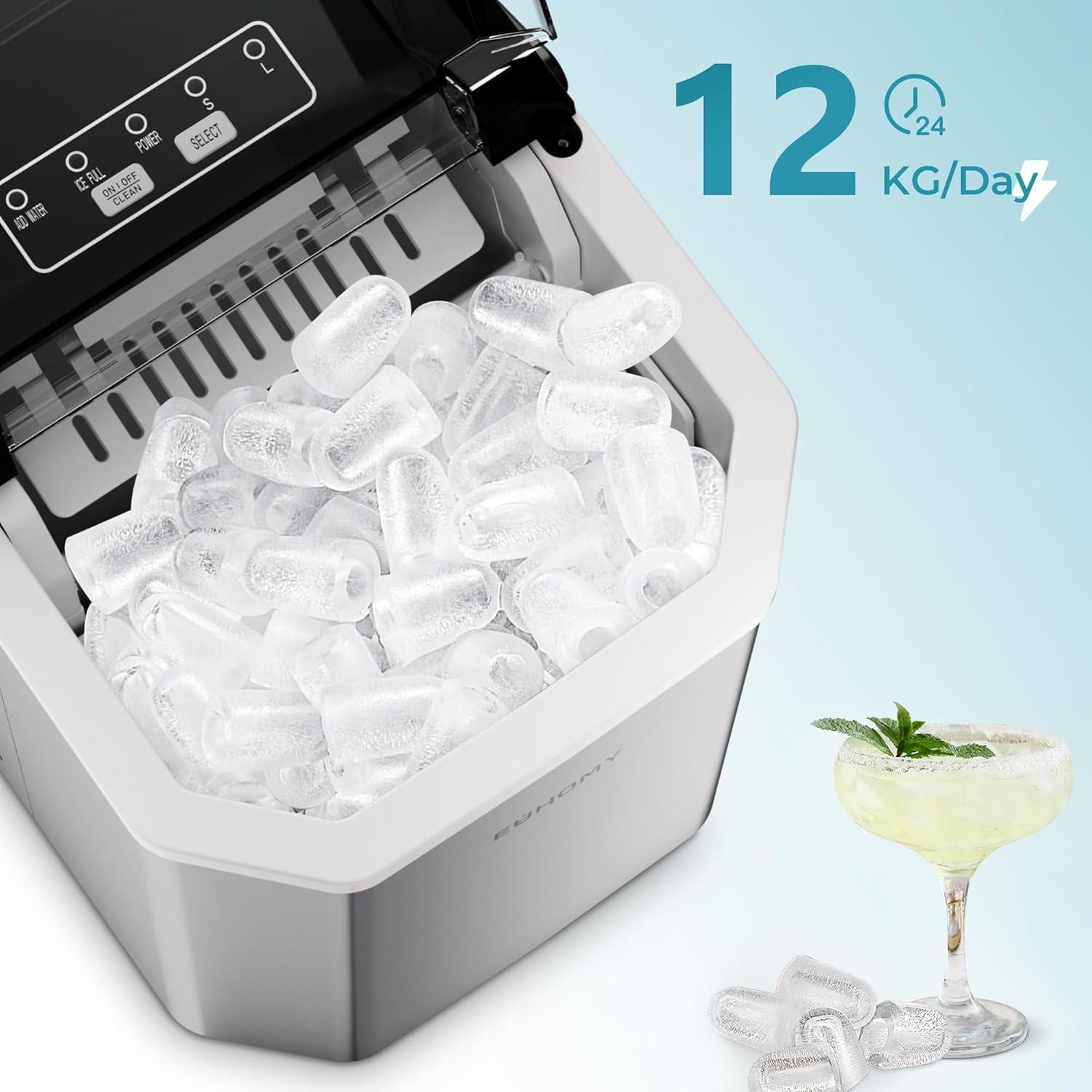 EUHOMY Ice Maker, 9 Cube in 6 Min, Bullet Ice maker, 2 Size Cube, Countertop Ice Machine, 12kg/Day, Self-Cleaning with Ice Scoop & Basket, for Home//Kitchen/Office/RV, Silver