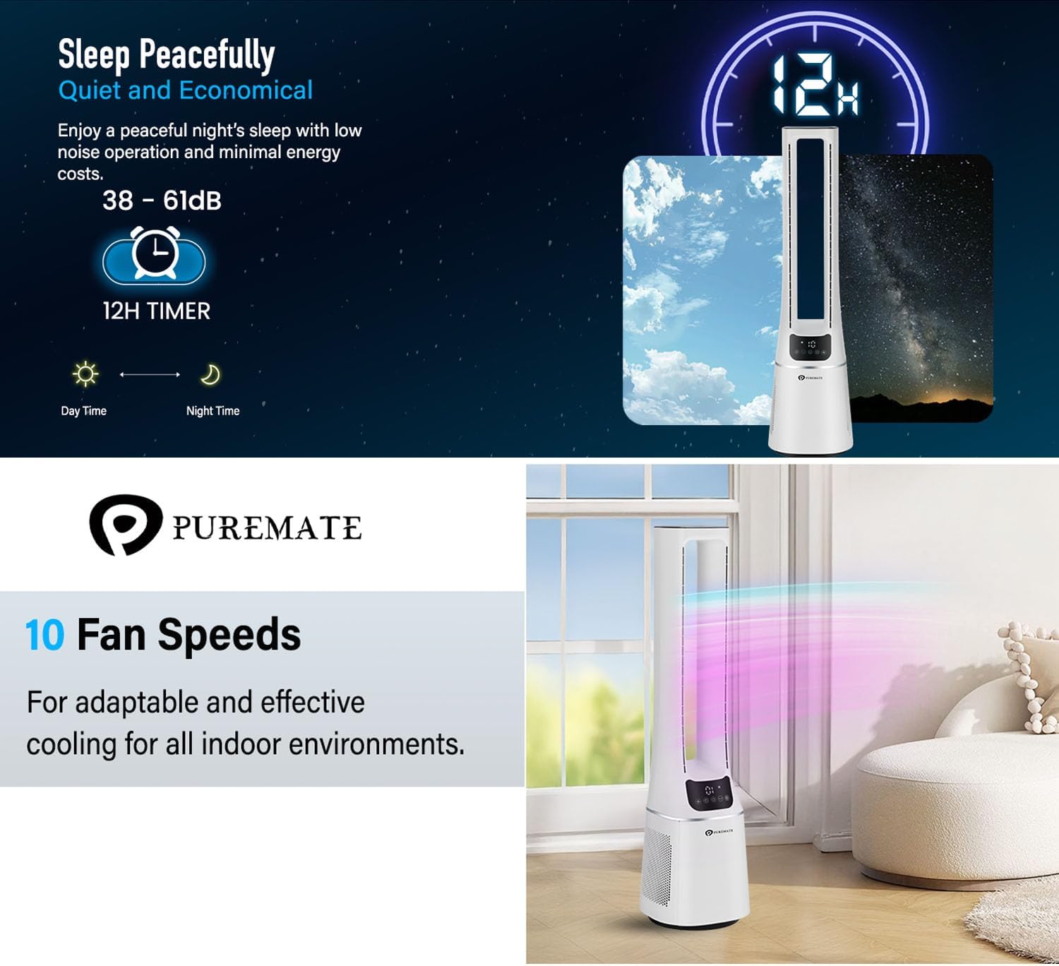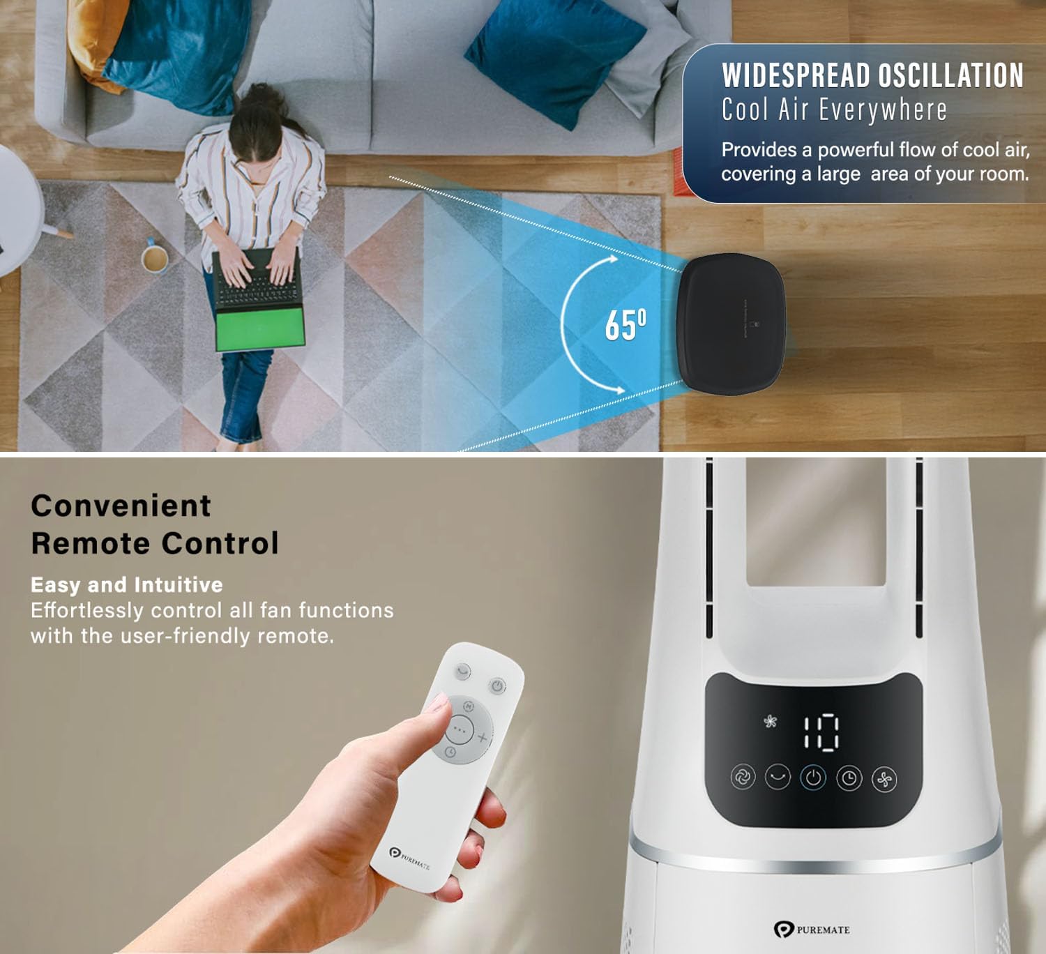 PureMate 2-in-1 Bladeless Tower Fan & air purifier with HEPA Filter, 10 Speed Settings, Portable Ultra Quiet Standing Fan with Remote Control, Digital Display, Powerful Air Cooling for home & office